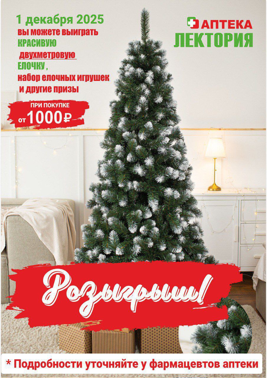 Делайте покупку от 1000 рублей в аптеках сети ЛЕКТОРИЯ и участвуйте в розыгрыше красивой ёлочки в Ваш дом. Акция проходит во всех аптеках сети Лектория в период с 1 до 30 ноября 2025 года.